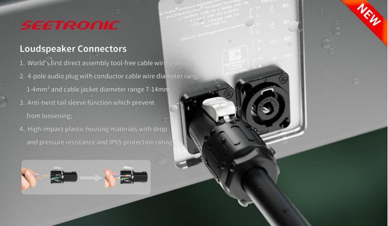 Among them, the tool-free design of the 4-pole loudspeaker connector is convenient for user to install the cable.  With IP65 protection rating, the anti-twist function prevents the tail sleeve from loosening and the high-impact plastic material is resistant to pressure and fall.